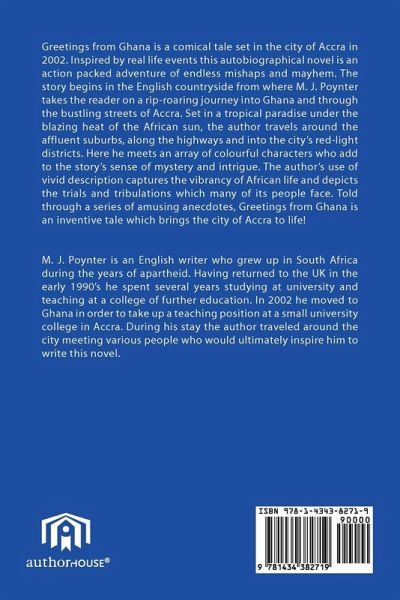 Greetings from Ghana is a comical tale set in the city of Accra in 2002. Inspired by real life events this autobiographical novel is an action packed adventure of endless mishaps and mayhem. The story begins in the English countryside from where M. J. Poynter takes the reader on a rip-roaring journey into Ghana and through the bustling streets of Accra. Set in a tropical paradise under the blazing heat of the African sun, the author travels around the affluent suburbs, along the highways and into the city's red-light districts. Here he meets an array of colourful characters who add to the story's sense of mystery and intrigue. The author's use of vivid description captures the vibrancy of African life and depicts the trials and tribulations which many of its people face. Told through a series of amusing anecdotes, Greetings from Ghana is an inventive tale which brings the city of Accra to life!