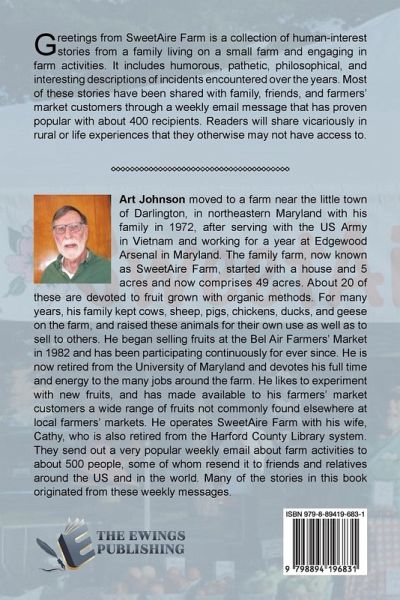 Art Johnson moved to a farm near the little town of Darlington, in northeastern Maryland with his family in 1972, after serving with the US Army in Vietnam and working for a year at Edgewood Arsenal in Maryland. The family farm, now known as SweetAire Farm, started with a house and 5 acres and now comprises 49 acres. About 20 of these are devoted to fruit grown with organic methods. For many years, his family kept cows, sheep, pigs, chickens, ducks, and geese on the farm, and raised these animals for their own use as well as to sell to others. He began selling fruits at the Bel Air Farmers' Market in 1982 and has been participating continuously for ever since. He is now retired from the University of Maryland and devotes his full time and energy to the many jobs around the farm. He likes to experiment with new fruits, and has made available to his farmers' market customers a wide range of fruits not commonly found elsewhere at local farmers' markets. He operates SweetAire Farm with his wife, Cathy, who is also retired from the Harford County Library system. They send out a very popular weekly email about farm activities to about 500 people, some of whom resend it to friends and relatives around the US and in the world. Many of the stories in this book originated from these weekly messages.