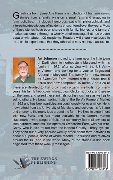 Art Johnson moved to a farm near the little town of Darlington, in northeastern Maryland with his family in 1972, after serving with the US Army in Vietnam and working for a year at Edgewood Arsenal in Maryland. The family farm, now known as SweetAire Farm, started with a house and 5 acres and now comprises 49 acres. About 20 of these are devoted to fruit grown with organic methods. For many years, his family kept cows, sheep, pigs, chickens, ducks, and geese on the farm, and raised these animals for their own use as well as to sell to others. He began selling fruits at the Bel Air Farmers' Market in 1982 and has been participating continuously for ever since. He is now retired from the University of Maryland and devotes his full time and energy to the many jobs around the farm. He likes to experiment with new fruits, and has made available to his farmers' market customers a wide range of fruits not commonly found elsewhere at local farmers' markets. He operates SweetAire Farm with his wife, Cathy, who is also retired from the Harford County Library system. They send out a very popular weekly email about farm activities to about 500 people, some of whom resend it to friends and relatives around the US and in the world. Many of the stories in this book originated from these weekly messages.