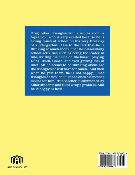Greg Likes Triangles For Lunch is about a 5-year old who is very excited because he is eating lunch at school on his very first day of kindergarten. Due to the fact that he is thinking so much about lunch he misses many school activities such as being the leader in line, writing his name on the board, playing Duck, Duck, Goose and even getting lost in line! All he seems to be thinking about are the triangles he will have for lunch. And then when he gets them, he is not happy. The triangles do not look like the ones his mother makes for him. The teacher is summoned by other students and fixes Greg's problem. And he is happy at last!