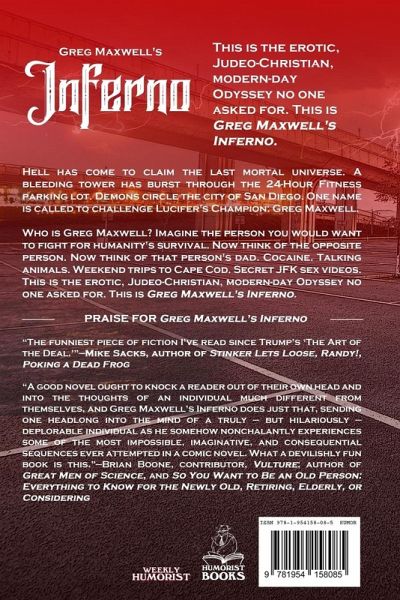 Hell has come to claim the last mortal universe. A bleeding tower has burst through the 24-Hour Fitness parking lot. Demons circle the city of San Diego. One name is called to challenge Lucifer's Champion: Greg Maxwell. Who is Greg Maxwell? Imagine the person you would want to fight for humanity's survival. Now think of the opposite person. Now think of that person's dad. Cocaine. Talking animals. Weekend trips to Cape Cod. Secret JFK sex videos. This is the erotic, Judeo-Christian, modern-day Odyssey no one asked for. This is Greg Maxwell's Inferno.