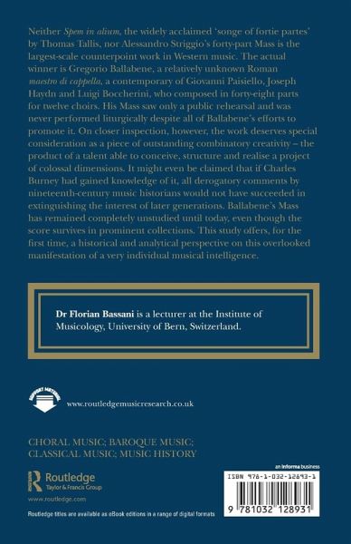 Neither Spem in alium, the widely acclaimed 'songe of fortie partes' by Thomas Tallis, nor Alessandro Striggio's forty-part Mass is the largest-scale counterpoint work in Western music. The actual winner is Gregorio Ballabene, a relatively unknown Roman maestro di cappella, a contemporary of Giovanni Paisiello, Joseph Haydn and Luigi Boccherini, who composed in forty-eight parts for twelve choirs. His Mass saw only a public rehearsal and was never performed liturgically despite all of Ballabene's efforts to promote it. On closer inspection, however, the work deserves special consideration as a piece of outstanding combinatory creativity - the product of a talent able to conceive, structure and realise a project of colossal dimensions. It might even be claimed that if Charles Burney had gained knowledge of it, all derogatory comments by nineteenth-century music historians would not have succeeded in extinguishing the interest of later generations. Ballabene's Mass has remained completely unstudied until today, even though the score survives in prominent collections. This study offers, for the first time, a historical and analytical perspective on this overlooked manifestation of a very individual musical intelligence.