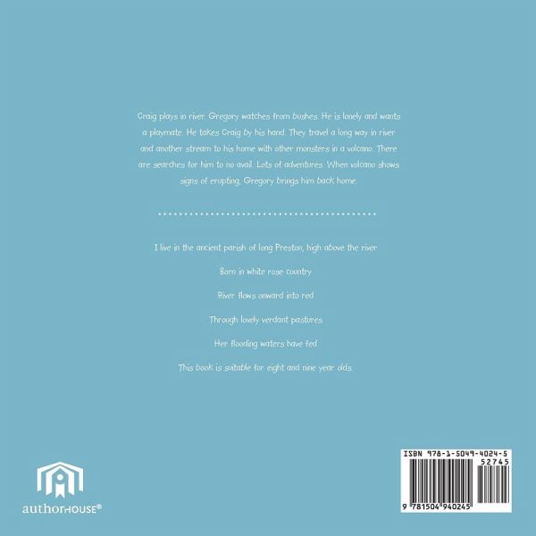 Craig plays in river. Gregory watches from bushes. He is lonely and wants a playmate. He takes Craig by his hand. They travel a long way in river and another stream to his home with other monsters in a volcano. There are searches for him to no avail. Lots of adventures. When volcano shows signs of erupting, Gregory brings him back home.