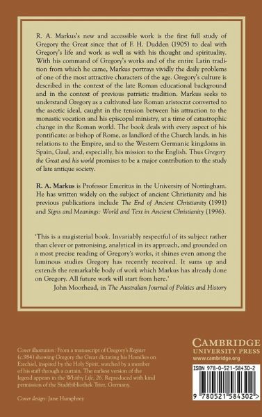Markus's new and accessible work is the first full study of Gregory the Great since that of F. H. Dudden (1905) to deal with both Gregory's life and work as well as with his thought and spirituality. With his command of Gregory's works, Markus portrays vividly the daily problems of one of the most attractive characters of the age. Gregory's culture is described in the context of the late Roman educational background and in the context of previous patristic tradition. Markus seeks to understand Gregory as a cultivated late Roman aristocrat converted to the ascetic ideal, caught in the tension between his attraction to the monastic vocation and his episcopal ministry, at a time of catastrophic change in the Roman world. The book deals with every aspect of his pontificate: as bishop of Rome, as landlord of the Church lands, in his relations to the Empire, and to the Western Germanic kingdoms in Spain, Gaul, and, especially, his mission to the English.