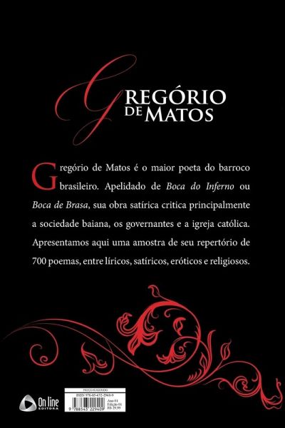 Gregório de Matos é o maior poeta do barroco brasileiro. Apelidado de Boca do Inferno ou Boca de Brasa, sua obra satírica critica principalmente a sociedade baiana, os governantes e a igreja católica.Apresentamos aqui uma amostra de seu repertório de 700 poemas, entre líricos, satíricos, eróticos e religiosos.
