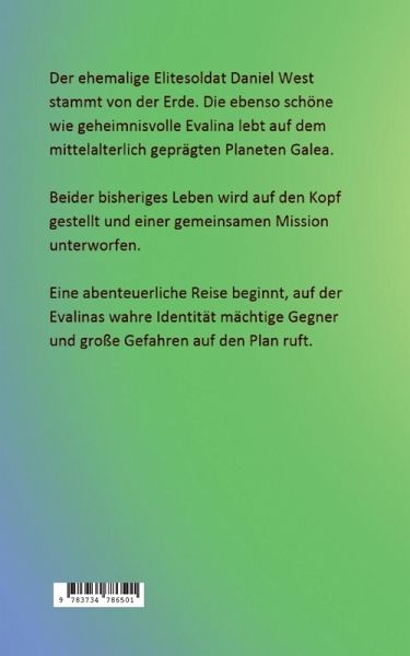 Der ehemalige Elitesoldat Daniel West stammt von der Erde. Die ebenso schönewie geheimnisvolle Evalina lebt auf demmittelalterlich geprägten Planeten Galea. Beider bisheriges Leben wird auf den Kopfgestellt und einer gemeinsamen Missionunterworfen.Eine abenteuerliche Reise beginnt, auf derEvalinas wahre Identität mächtige Gegnerund große Gefahren auf den Plan ruft.