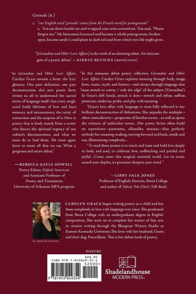 [Grenadine and Other Love Affairs] is the work of an alarming talent. An intricate gem of a poetic debut." "Grace's poetry is laden with sensuous imagery: 'Ignominious fruit of that garden / my carmine lips, your garnet desire.' The most compelling aspect of this ingenious body of verse is the poet's determination to excavate ever deeper layers of meaning..."-Kirkus Reviews (starred review) "A gorgeous and smart debut." -Rebecca Gayle Howell, Poetry Editor, Oxford American "In this sensuous debut poetry collection, Grenadine and Other Love Affairs, Carolyn Grace explores meaning through body, image, form, music, myth, and history-and always through language that 'must stretch to convey / only the edge' of the subject ('Grenadine'). In Grace's deft hands, stretch it does-stretch and infuse, suffuse, penetrate, undercut, probe, and play with meaning...To read these poems is to touch and taste and hold love deeply in body and soul, to celebrate love, unflinching and painful and joyful. 'Poetry,' Grace writes, is 'prayer-a desired exactitude of thought-the magical incantation of the essential ('Delphic', in 'Reverie').' Come, enter this magical, essential world. Let its music sound your depths, its precision sharpen your mind. Then prepare to leave changed, your self challenged and enlarged." - LIBBY FALK JONES, Professor of English, Emerita, Berea College