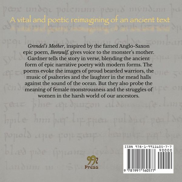 A vital, poetic reimagining of an ancient text. Grendel's Mother, inspired by the famous Anglo-Saxon epic poem Beowulf, gives a voice to the monster's mother. Gardner tells the story in verse, blending the ancient form of epic poetry with modern forms. Grendel's Mother is unnamed in Beowulf, and she remains unnamed here. This seemingly essential lack speaks about the marginalised everywhere. It shows that the unknown and the disregarded can relate their experiences and that their perspectives have value. The poems evoke images of proud warriors, the music of the psaltery, laughter in the mead hall and the sounds of nature, the forest, and the ocean. They also probe the meaning of monstrousness in womanhood and the struggles of a marginalised human being in the harsh world of our ancestors, and, indeed, in any world.