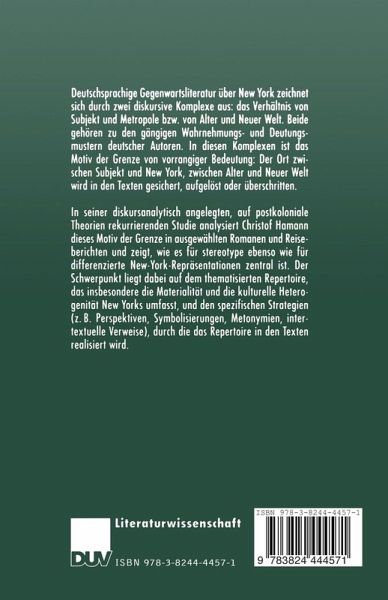 Deutschsprachige Gegenwartsliteratur über New York zeichnet sich durch zwei diskursive Komplexe aus: das Verhältnis von Subjekt und Metropole bzw. von Alter und Neuer Welt. Beide gehören zu den gängigen Wahrnehmungs- und Deutungsmustern deutscher Autoren. In diesen Komplexen ist das Motiv der Grenze von vorrangiger Bedeutung: Der Ort zwischen Subjekt und New York, zwischen Altern und Neuer Welt wird in den Texten gesichert, aufgelöst oder überschritten.