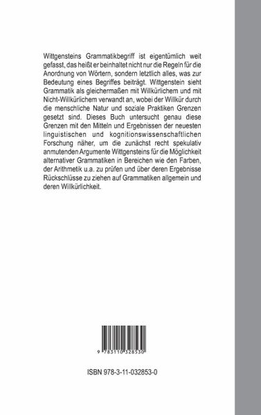 Wittgensteins Grammatikbegriff ist eigentümlich weit gefasst, das heißt er beinhaltet nicht nur die Regeln für die Anordnung von Wörtern, sondern letztlich alles, was zur Bedeutung eines Begriffes beiträgt. Wittgenstein sieht Grammatik als gleichermaßen mit Willkürlichem und mit Nicht-Willkürlichem verwandt an, wobei der Willkür durch die menschliche Natur und soziale Praktiken Grenzen gesetzt sind. Dieses Buch untersucht genau diese Grenzen mit den Mitteln und Ergebnissen der neuesten linguistischen und kognitionswissenschaftlichen Forschung näher, um die zunächst recht spekulativ anmutenden Argumente Wittgensteins für die Möglichkeit alternativer Grammatiken in Bereichen wie den Farben, der Arithmetik u.a. zu prüfen und über deren Ergebnisse Rückschlüsse zu ziehen auf Grammatiken allgemein und deren Willkürlichkeit.