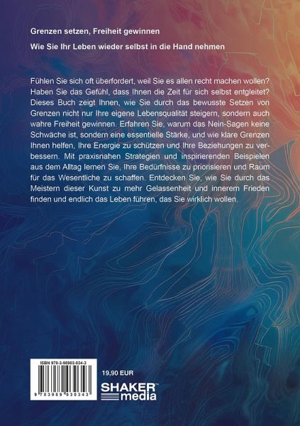 Grenzen setzen, Freiheit gewinnen Wie Sie Ihr Leben wieder selbst in die Hand nehmen Fühlen Sie sich oft überfordert, weil Sie es allen recht machen wollen? Haben Sie das Gefühl, dass Ihnen die Zeit für sich selbst entgleitet? Dieses Buch zeigt Ihnen, wie Sie durch das bewusste Setzen von Grenzen nicht nur Ihre eigene Lebensqualität steigern, sondern auch wahre Freiheit gewinnen. Erfahren Sie, warum das Nein-Sagen keine Schwäche ist, sondern eine essentielle Stärke, und wie klare Grenzen Ihnen helfen, Ihre Energie zu schützen und Ihre Beziehungen zu verbessern. Mit praxisnahen Strategien und inspirierenden Beispielen aus dem Alltag lernen Sie, Ihre Bedürfnisse zu priorisieren und Raum für das Wesentliche zu schaffen. Entdecken Sie, wie Sie durch das Meistern dieser Kunst zu mehr Gelassenheit und innerem Frieden finden und endlich das Leben führen, das Sie wirklich wollen.
