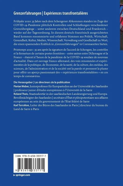 Neue Herausforderungen, alte Grenzen? Wie die COVID-19-Pandemie das deutsch-französische Verhältnis aufwirbelt Nouveaux défis, vieilles frontières ? La pandémie de COVID-19 chahute les relations franco-allemandes.- Die Rückkehr europäischer Binnengrenzen?! Die COVID-19-Pandemie als Zäsur für Verflechtungsräume Le retour des frontières internes à l'espace européen ?! La pandémie de COVID-19, une césure pour l'espace transfrontalier.- Berlin-Paris: Politische Perspektiven auf die Turbulenzen im Frühjahr 2020 Berlin-Paris : Perspectives politiques sur les turbulences du printemps 2020.- Corona- und Grenzkrise vor Ort: Das Handeln der Politik im regionalen und lokalen Kontext COVID-19 et situation de crise aux frontières : L'action politique au niveau régional et local.- Einblicke in das deutsch-französische Krisenmanagement Aperçus du management franco-allemand de crise.- Von Grenzblockaden und Grenzüberschreitungen: Kultur - Medien - Bevölkerung Du retour des frontières à la libre circulation : Culture - médias - citoyens.- Die COVID-19-Pandemie und Grenzreflexe: Stimmen aus der Wissenschaft Pandémie de COVID-19 et réflexes nationaux : témoignages du monde universitaire.- Und nun? Lehren aus der Krise Et maintenant ? Quelles leçons tirer de la crise ?