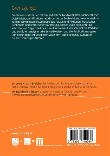 Vorbemerkung.- I. Vorwort.- Das Problem der Grenze: Die hintergründige Aktualität des New Journalism - eine Einführung.- Intermedialität von Journalismus und Literatur: New Journalism aus literaturwissenschaftlicher Perspektive.- II. Hintergrund.- Fiktion, Fakt & Fake?: Geschichte, Merkmale und Protagonisten des New Journalism in den USA.- Fakten und/oder Fiktionen: Zur Geschichte der Beziehungen zwischen Journalismus und Literatur in Deutschland.- Jenseits der Grenzen: Die problematische Unterscheidung zwischen Fakt und Fiktion.- "Sex, Drugs & Bücher schreiben": New Journalism im Spannungsfeld von medialem und literarischem Erzählen.- Factual Fiction: Zur Differenzierungsgeschichte von Literatur und Journalismus aus systemtheoretischer Perspektive.- III. Porträts.- Tom Wolfe und der Mythos vom New Journalism: Porträt eines Karrieristen im interkulturellen Vergleich.- Dandy, Diva & Outlaw: Die Inszenierungen des New Journalism.- Mit doppelter Zunge: Tom Kummer und der New Journalism.- Generation Tristesse: Zum Verhältnis von Literatur und Journalismus in der jüngeren Popliteratur.- IV. Milieus des New Journalism.- Die Tempojahre: Merkmale des deutschsprachigen New Journalism am Beispiel der Zeitschrift Tempo.- Der schnelle Marsch durch die Institutionen: Formen des New Journalism in etablierten Medien - Zur Diffusion eines innovativen Journalismuskonzeptes.- Gehetzte Erben, hektische Epigonen: Spurenelemente des New Journalism in amerikanischen und britischen Zeitschriften.- Regime der Wahrheit: Docu-Soaps als New Journalism im Fernsehen?.- Grenzgänger im World Wide Web: "Way New Journalism" und nonfiktionales Erzählen im Internet.- Autorenverzeichnis.