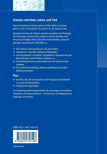 Univ.-Prof. Dr. med. Walter Buzello, vorm. Direktor der Klinik für Anästhesiologie und Operative Intensivmedizin der Universität zu Köln" -- Als Grenzsituationen in der Intensivmedizin werden in 26 Kapiteln u. a. Erleben der Intensivtherapie, Bewusstseinsstörungen, Nah-Tod-Erfahrungen, Lebenserhalt vs. Sterben in Würde, Therapiebegrenzung, Verlaufsprognosen und Sterbehilfe dargestellt. Die 40 Autoren bzw. Coautoren sind Intensivmediziner verschiedenster Fachzugehörigkeit, Komaforscher, Palliativmediziner, Pflegepersonal, Juristen und Kriminologen, Wirtschaftswissenschaftler, Statistiker, Ethiker und Philosophen sowie katholische und evangelische Theologen.