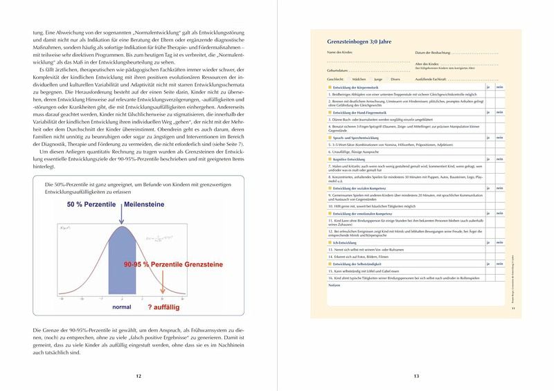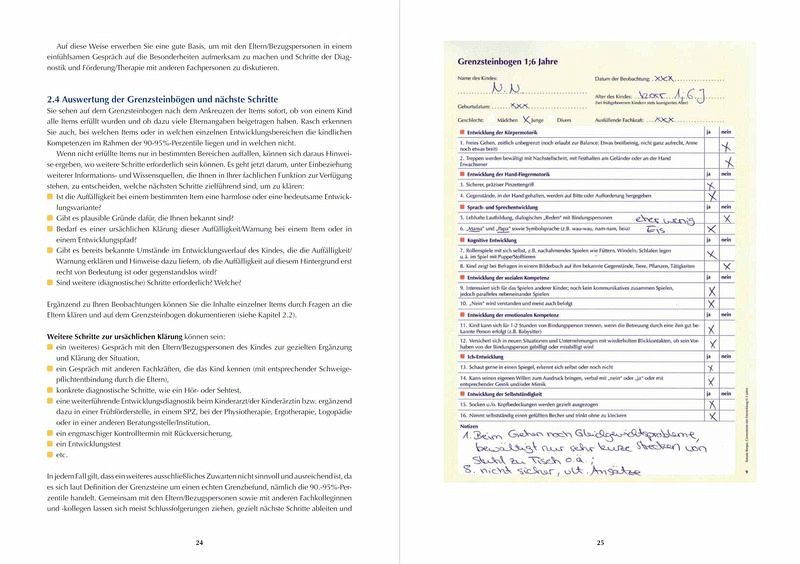 Im Leitfaden zu den Grenzsteinen der Entwicklung finden sich alle Hintergrundinformationen zur richtigen Anwendung des Beobachtungsinstruments. Die Grenzsteine der Entwicklung sind ein Screeningverfahren zur schnellen und gezielten Entwicklungsbeobachtung und -dokumentation für Kinder von 6 Monaten bis 6 Jahren. Das Instrument gibt Auskunft darüber, ob sich ein Kind in den neun Entwicklungsbereichen altersgemäß entwickelt oder in welchen Bereichen ein Kind die definierten Entwicklungsnormen nicht erfüllt.