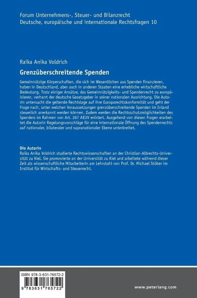 Gemeinnützige Körperschaften, die sich im Wesentlichen aus Spenden finanzieren, haben in Deutschland, aber auch in anderen Staaten eine erhebliche wirtschaftliche Bedeutung. Trotz einiger Ansätze, das Gemeinnützigkeits- und Spendenrecht zu europäisieren, verharrt der deutsche Gesetzgeber in seiner nationalen Ausrichtung. Die Autorin untersucht die geltende Rechtslage auf ihre Europarechtskonformität und geht der Frage nach, unter welchen Voraussetzungen grenzüberschreitende Spenden im Inland steuerlich anerkannt werden können. Zudem werden die Rechtsschutzmöglichkeiten des Spenders im Rahmen von Art. 267 AEUV erörtert. Ausgehend von diesen Fragen erarbeitet die Autorin Regelungsvorschläge für eine internationale Öffnung des Spendenrechts auf nationaler, bilateraler und supranationaler Ebene unterbreitet.