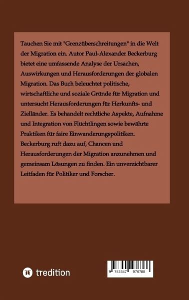 Entdecken Sie mit "Grenzüberschreitungen: Migration, Integration und die Herausforderungen unserer Zeit" eine tiefgreifende und umfassende Analyse des aktuellen globalen Phänomens der Migration. Verfasst von renommiertem Autor Paul-Alexander Beckerburg, bietet dieses Sachbuch einen fundierten Einblick in die Ursachen, Auswirkungen und Herausforderungen der weltweiten Migration.Tauchen Sie ein in eine sorgfältig recherchierte Darstellung der politischen, wirtschaftlichen und sozialen Gründe, die Menschen dazu bewegen, ihre Heimatländer zu verlassen. Erfahren Sie mehr über die Herausforderungen, denen Herkunfts- und Zielländer gegenüberstehen, und die Auswirkungen der Migration auf soziale Strukturen und kulturelle Identitäten.Beckerburg präsentiert in diesem Werk auch eine detaillierte Untersuchung der rechtlichen und ethischen Aspekte der Flüchtlingskrise sowie der Herausforderungen bei der Aufnahme und Integration von Flüchtlingen. Dabei werden bewährte Praktiken und erfolgreiche Modelle für Einwanderungspolitiken vorgestellt, die zur Schaffung fairer und effektiver Systeme beitragen.Dieses Buch bietet jedoch nicht nur eine Analyse, sondern regt auch zu einem tieferen Verständnis und einem Handeln in Solidarität an. Beckerburg lädt die Leser ein, die vielfältigen Chancen und Herausforderungen der Migration anzunehmen und gemeinsam Lösungen zu entwickeln, um eine gerechtere und inklusivere Gesellschaft zu schaffen."Grenzüberschreitungen" ist ein unverzichtbarer Leitfaden für Politiker, Entscheidungsträger, Forscher und alle, die an einer fundierten Auseinandersetzung mit dem Thema Migration interessiert sind. Tauchen Sie ein in dieses informative Werk und tragen Sie dazu bei, die Herausforderungen unserer Zeit besser zu verstehen und konstruktive Lösungen zu finden.
