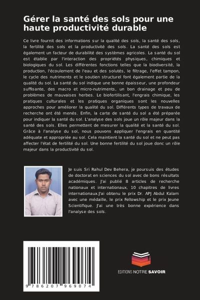 Ce livre fournit des informations sur la qualité des sols, la santé des sols, la fertilité des sols et la productivité des sols. La santé des sols est également un facteur de durabilité des systèmes agricoles. La santé du sol est établie par l'interaction des propriétés physiques, chimiques et biologiques du sol. Les différentes fonctions telles que la biodiversité, la production, l'écoulement de l'eau et des solutés, le filtrage, l'effet tampon, le cycle des nutriments et le soutien structurel font également partie de la qualité du sol. La santé du sol indique une bonne épaisseur, une profondeur suffisante, des macro et micro-nutriments, un bon drainage et peu de problèmes de mauvaises herbes. Le biofertilisant, l'engrais chimique, les pratiques culturales et les pratiques organiques sont les nouvelles approches pour améliorer la qualité du sol. Différents types de travaux de recherche ont été menés. Enfin, la carte de santé du sol a été préparée pour indiquer la santé du sol. L'analyse des sols joue un rôle majeur dans la santé des sols. Elles permettent de mesurer la qualité et la santé du sol. Grâce à l'analyse du sol, nous pouvons appliquer l'engrais en quantité adéquate et appropriée au sol. Cela maintient la santé du sol et ne peut pas affecter l'état de fertilité du sol. Une bonne fertilité du sol joue donc un rôle majeur dans la productivité du sol.