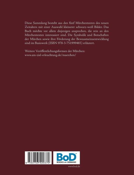 Diese Sammlung besteht aus den fünf Märchentexten des neuen Zeitalters mit einer Auswahl kleinerer schwarz-weiß Bilder. Dieses Buch möchte vor allem diejenigen ansprechen, die rein an den Märchentexten interessiert sind. Die Symbolik und Botschaften der Märchen sowie ihre Förderung der Bewusstseinsentwicklung sind im Basiswerk (ISBN 978-3-751999465) erläutert. Weitere Veröffentlichungsformen der Märchen: www.am-ziel-erleuchtung.de/maerchen