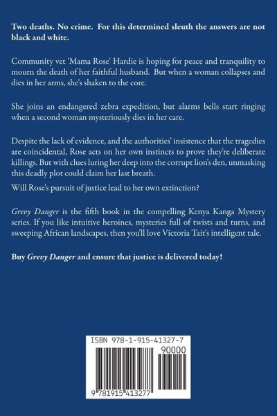 Two deaths. No crime. For this determined sleuth the answers are not black and white. Community vet 'Mama Rose' Hardie is hoping for peace and tranquility to mourn the death of her faithful husband. But when a woman collapses and dies in her arms, she's shaken to the core. She joins an endangered zebra expedition, but alarms bells start ringing when a second woman mysteriously dies in her care. Despite the lack of evidence, and the authorities' insistence that the tragedies are coincidental, Rose acts on her own instincts to prove they're deliberate killings. But with clues luring her deep into the corrupt lion's den, unmasking this deadly plot could claim her last breath. Will Rose's pursuit of justice lead to her own extinction? Grevy Danger is the fifth book in the compelling Kenya Kanga Mystery series. If you like intuitive heroines, mysteries full of twists and turns, and sweeping African landscapes, then you'll love Victoria Tait's intelligent tale. Buy Grevy Danger and ensure that justice is delivered today!