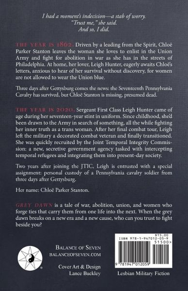 I had a moment's indecision-a stab of worry. "Trust me," she said. And so, I did. The year is 1862. Driven by a leading from the Spirit, Chloë Parker Stanton leaves the woman she loves to enlist in the Union Army and fight for abolition in war as she has in the streets of Philadelphia. At home, her lover, Leigh Hunter, eagerly awaits Chloë's letters, anxious to hear of her survival without discovery, for women are not allowed to wear the Union blue. Three days after Gettysburg comes the news: the Seventeenth Pennsylvania Cavalry has survived, but Chloë Stanton is missing, presumed dead. The year is 2020. Sergeant First Class Leigh Hunter came of age during her seventeen-year stint in uniform. Since childhood, she'd been drawn to the Army in search of something, all the while fighting her inner truth as a trans woman. After her final combat tour, Leigh left the military a decorated combat veteran and finally transitioned. She was quickly recruited by the Joint Temporal Integrity Commission: a new, secretive government agency tasked with intercepting temporal refugees and integrating them into present-day society. Two years after joining the JTIC, Leigh is entrusted with a special assignment: personal custody of a Pennsylvania cavalry soldier from three days after Gettysburg. Her name: Chloë Parker Stanton. Grey Dawn is a tale of war, abolition, union, and women who forge ties that carry them from one life into the next. When the grey dawn breaks on a new era and a new cause, who can you trust to fight beside you?¿