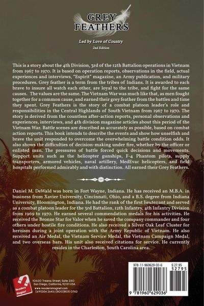 Grey Feathers is the story of a combat platoon leader's role and responsibilities in the Central Highlands of South Vietnam from 1967 to 1970. The story is derived from the countless after-action reports, personal observations and experiences, interviews, and 4th division magazine articles about this period of the Vietnam War. The unit served was the 3rd Battalion, 12th Infantry, 4th Infantry Division, which was a highly decorated unit marked by a cloverleaf symbol of the 4th Division. It was nicknamed "the Braves." In 1967 when the unit was transferred to the border of Laos, Cambodia, and Vietnam, the unit's main supply route in the field was highway 19, a road frequently ambushed and mined to hamper resupply efforts. The term grey feather was given to each man who served unselfishly in the unit, because all were battle-tested and watched each other's back during conflict. It created a sense of calling and a satisfaction to serve. Battle scenes are described as accurately as possible, based on combat action reports. It is the intent of this book to describe the events and show how unselfish and brave the unit responded to overcome the overwhelming battle condition odds. It also shows the difficulties of decision-making under fire, whether by officer or enlisted man. The pressures of battle forced quick decisions and movements. Support units such as the helicopter gunships, F-4 Phantom pilots, supply transporters, armored vehicles, naval artillery, MedEvac helicopters, and field hospitals performed admirably and with distinction. All earned their Grey Feathers.