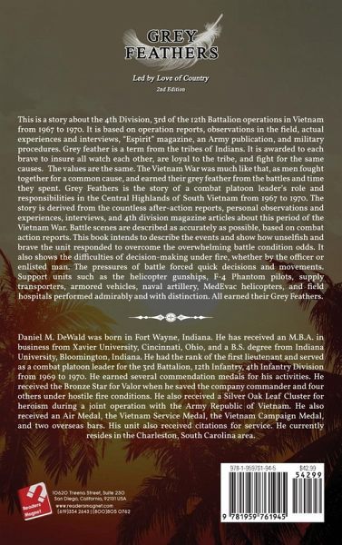 Grey Feathers is the story of a combat platoon leader's role and responsibilities in the Central Highlands of South Vietnam from 1967 to 1970. The story is derived from the countless after-action reports, personal observations and experiences, interviews, and 4th division magazine articles about this period of the Vietnam War. The unit served was the 3rd Battalion, 12th Infantry, 4th Infantry Division, which was a highly decorated unit marked by a cloverleaf symbol of the 4th Division. It was nicknamed "the Braves." In 1967 when the unit was transferred to the border of Laos, Cambodia, and Vietnam, the unit's main supply route in the field was highway 19, a road frequently ambushed and mined to hamper resupply efforts. The term grey feather was given to each man who served unselfishly in the unit, because all were battle-tested and watched each other's back during conflict. It created a sense of calling and a satisfaction to serve. Battle scenes are described as accurately as possible, based on combat action reports. It is the intent of this book to describe the events and show how unselfish and brave the unit responded to overcome the overwhelming battle condition odds. It also shows the difficulties of decision-making under fire, whether by officer or enlisted man. The pressures of battle forced quick decisions and movements. Support units such as the helicopter gunships, F-4 Phantom pilots, supply transporters, armored vehicles, naval artillery, MedEvac helicopters, and field hospitals performed admirably and with distinction. All earned their Grey Feathers.
