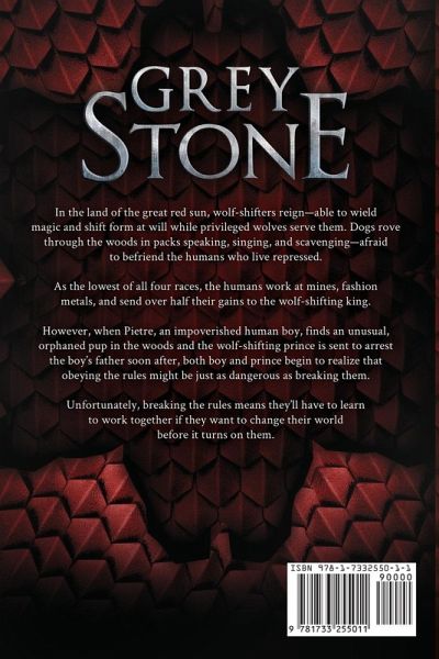 In the land of the great red sun, dogs sing, wolves kill, humans serve, and wolf-shifters rule with magic and menace. Pietre is a human boy who has spent the last thirteen years afraid of the sunset, the Blødguard, and the wolf-shifting masters who rule his world. Wittendon is a werewolf prince who has spent the last nineteen years afraid of his father, his inability to do magic, and the upcoming tournament he's sure to lose. But when Pietre finds an orphaned pup in the woods and Wittendon is forced to arrest the boy's father soon after, both of them begin to realize that keeping the rules might be just as terrifying as breaking them. Now serf and master must learn to cut through their own prejudices and work together in order to turn their world before it turns on them. Grey Stone is a story of dogs who talk, wolves who kill, and a stone that-for better or worse-can change all that.