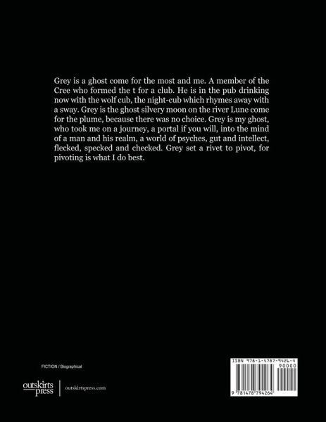Grey is a ghost come for the most and me. A member of the Cree who formed the t for a club. He is in the pub drinking now with the wolf cub, the night-cub which rhymes away with a sway. Grey is the ghost silvery moon on the river Lune come for the plume, because there was no choice. Grey is my ghost, who took me on a journey, a portal if you will, into the mind of a man and his realm, a world of psyches, gut and intellect, flecked, specked and checked. The Grey set a rivet to pivot, for pivoting is what I do best.