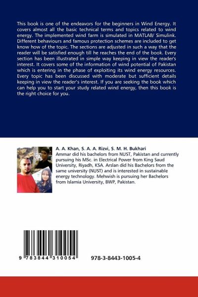 This book is one of the endeavors for the beginners in Wind Energy. It covers almost all the basic technical terms and topics related to wind energy. The implemented wind farm is simulated in MATLAB/ Simulink. Different behaviours and famous protection schemes are included to get know how of the topic. The sections are adjusted in such a way that the reader will be satisfied enough till he reaches the end of the book. Every section has been illustrated in simple way keeping in view the reader's interest. It covers some of the information of wind potential of Pakistan which is entering in the phase of exploiting its wind energy resources. Every topic has been discussed with moderate but sufficient details keeping in view the reader's interest. If you are seeking the book which can help you to start your study related wind energy, then this book is the right choice for you.