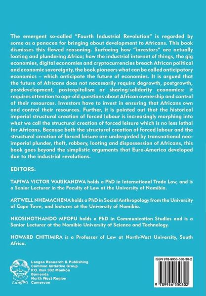 The emergent so-called "Fourth Industrial Revolution" is regarded by some as a panacea for bringing about development to Africans. This book dismisses this flawed reasoning. Surfacing how "investors" are actually looting and plundering Africa; how the industrial internet of things, the gig economies, digital economies and cryptocurrencies breach African political and economic sovereignty, the book pioneers what can be called anticipatory economics - which anticipate the future of economies. It is argued that the future of Africans does not necessarily require degrowth, postgrowth, postdevelopment, postcapitalism or sharing/solidarity economies: it requires attention to age-old questions about African ownership and control of their resources. Investors have to invest in ensuring that Africans own and control their resources. Further, it is pointed out that the historical imperial structural creation of forced labour is increasingly morphing into what we call the structural creation of forced leisure which is no less lethal for Africans. Because both the structural creation of forced labour and the structural creation of forced leisure are undergirded by transnational neo-imperial plunder, theft, robbery, looting and dispossession of Africans, this book goes beyond the simplistic arguments that Euro-America developed due to the industrial revolutions.