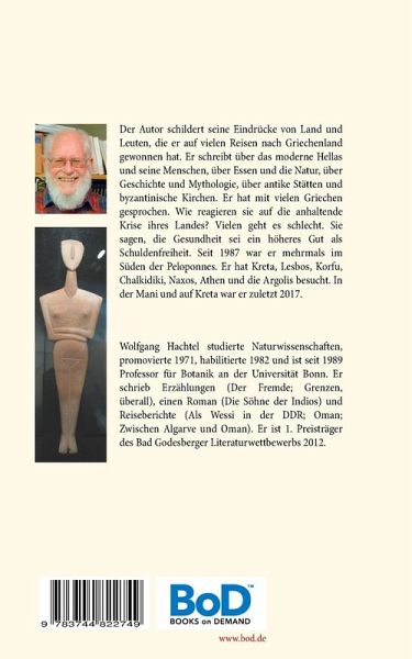 Wolfgang Hachtel schildert seine Eindrücke von Land und Leuten, die er auf vielen Reisen nach Griechenland gewonnen hat. Er schreibt über das moderne Hellas und seine Menschen, über das Essen und die Natur, über die Geschichte und Mythologie, über antike Stätten und byzantinische Kirchen. Er hat mit vielen Griechen gesprochen. Wie reagieren sie auf die anhaltende Krise ihres Landes? Vielen geht es schlecht. Sie sagen, die Gesundheit sei ein höheres Gut als Schuldenfreiheit. Seit 1987 war der Autor mehrmals im Süden der Peloponnes. Er hat Kreta, Lesbos, Korfu, Chalkidiki, Naxos, Athen und die Argolis besucht. In der Mani und auf Kreta war er zuletzt 2017.