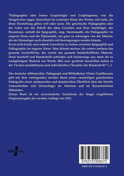 Der deutsche Althistoriker, Paläograph und Bibliothekar Viktor Gardthausen gibt mit dem vorliegenden zweiten Band seiner zweiteiligen griechischen Paläografie einen umfassenden und detailreichen Überblick über die Schrift, Unterschriften und Chronologie im Altertum und im Byzantinischen Mittelalter.