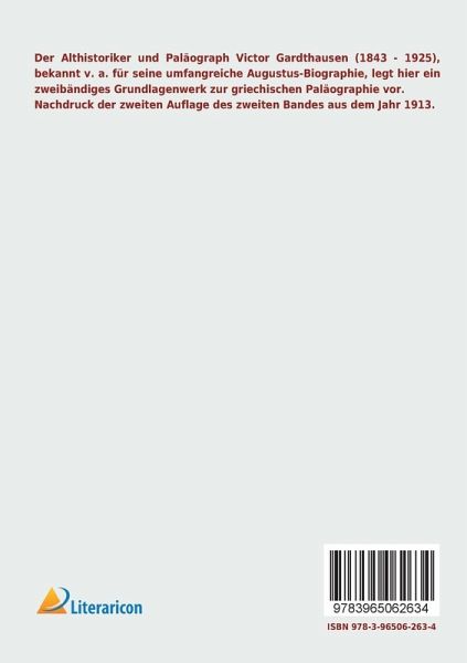 Der Althistoriker und Paläograph Victor Gardthausen (1843 - 1925), bekannt v. a. für seine umfangreiche Augustus-Biographie, legt hier ein zweibändiges Grundlagenwerk zur griechischen Paläographie vor. Nachdruck der zweiten Auflage des zweiten Bandes aus dem Jahr 1913.
