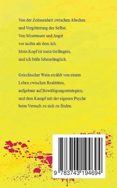 Von der Zerissenheit zwischen Abscheu und Vergötterung des Selbst. Von Misstrauen und Angst vor nichts als dem Ich. Mein Kopf ist mein Gefängnis,und ich büße lebenslänglich.Griechischer Wein erzählt von einemLeben zwischen Realitäten, aufgebaut auf Bewältigungsstrategien, und dem Kampf mit der eigenen Psyche beim Versuch zu sich zu finden.