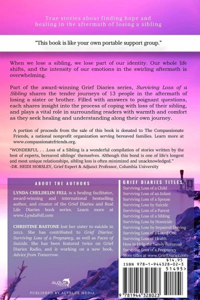 Christine lost her 38-year-old sister to suicide. Shannon lost her 21-year-old brother to a drunk driver. Brooke lost her 31-year-old brother to homicide. Part of the award-winning Grief Diaries series, Surviving Loss of a Sibling shares the poignant stories of 13 people who have lost a brother or sister. Covering tender issues such as surviving the funeral and transition, navigating the holidays, handling sensitive questions and more, Surviving Loss of a Sibling is a wonderful source of comfort for all who share the journey, and offers a treasured reminder that none of us walk this journey alone. See all books in the award-winning series at GriefDiaries.com. "CRITICALLY IMPORTANT . . . I want to say to Lynda that what you are doing is so critically important." -DR. BERNICE A. KING, Daughter of Dr. Martin Luther King
