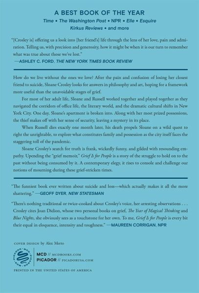 Named a Best Book of the Year by Vogue, TIME, The Washington Post, The Boston Globe, Esquire, NPR, Elle, Library Journal, LitHub, Oprah Daily, Publishers Weekly, Chicago Public Library, Kirkus, Bookpage, The Independent, and New Statesman Disarmingly witty and poignant, Sloane Crosley's memoir explores multiple kinds of loss following the death of her closest friend. How do we live without the ones we love? After the pain and confusion of losing her closest friend to suicide, Sloane Crosley looks for answers in philosophy and art, hoping for a framework more useful than the unavoidable stages of grief. For most of her adult life, Sloane and Russell worked together and played together as they navigated the corridors of office life, the literary world, and the dramatic cultural shifts in New York City. One day, Sloane's apartment is broken into. Along with her most prized possessions, the thief makes off with her sense of security, leaving a mystery in its place. When Russell dies exactly one month later, his death propels Sloane on a wild quest to right the unrightable, to explore what constitutes family and possession as the city itself faces the staggering toll of the pandemic. Sloane Crosley's search for truth is frank, wickedly funny, and gilded with resounding empathy. Upending the "grief memoir," Grief Is for People is a story of the struggle to hold on to the past without being consumed by it. A contemporary elegy, it rises to console and challenge our notions of mourning during these grief-stricken times.