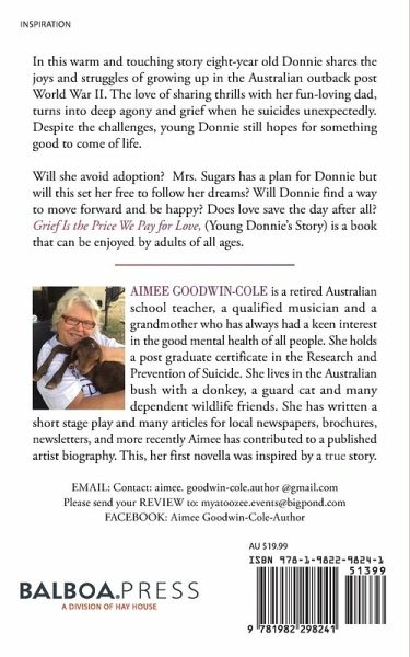 In this warm and touching story eight-year old Donnie shares the joys and struggles of growing up in the Australian outback post World War II. The love of sharing thrills with her fun-loving dad, turns into deep agony and grief when he suicides unexpectedly. Despite the challenges, young Donnie still hopes for something good to come of life. Will she avoid adoption? Mrs. Sugars has a plan for Donnie but will this set her free to follow her dreams? Will Donnie find a way to move forward and be happy? Does love save the day after all? Grief Is the Price We Pay for Love, (Young Donnie's Story) is a book that can be enjoyed by adults of all ages.
