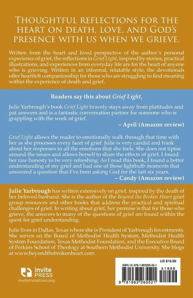 Thoughtful reflections for the heart on death, love, and God's presence with us when we grieve. Written from the heart and lived perspective of the author's personal experience of grief, the reflections in Grief Light, inspired by stories, practical illustrations, and experiences from everyday life are for the heart of anyone who is grieving. Written in an informal, relatable style, the devotionals offer heartfelt companionship for those who are struggling to find meaning within the experience of death and grief.