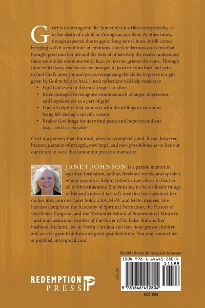 Grief is no stranger in life. Sometimes it strikes unexpectedly, as in the death of a child or through an accident. At other times, though expected due to age or long-term illness, it still comes bringing with it a multitude of emotions. Janet's reflections on events that brought grief into her life and the lives of others help the reader understand there are similar emotions we all face, yet no one grieves the same. Through these reflections, readers are encouraged to journey from hurt and pain to find God's inner joy and peace, recognizing the ability to grieve is a gift given by God to help us heal.