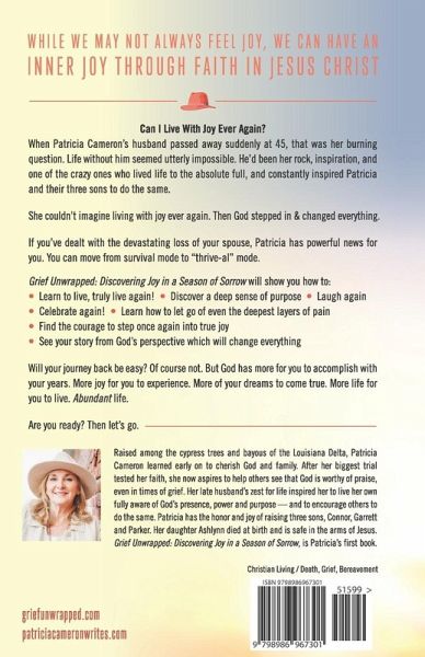 Can I Live With Joy Ever Again? When Patricia Cameron's husband passed away suddenly at 45, that was her burning question. Life without him seemed utterly impossible. He'd been her rock, inspiration, and one of the crazy ones who lived life to the absolute full, and constantly inspired Patricia and their three sons to do the same. She couldn't imagine living with joy ever again. Then God stepped in and changed everything. If you've dealt with the devastating loss of your spouse, Patricia has powerful news for you. You can move from survival mode to "thrive-al" mode. Grief Unwrapped: Discovering Joy in a Season of Sorrow will show you how to: * Learn to live, truly live again! * Discover a deep sense of purpose * Laugh again * Celebrate again! * Learn how to let go of even the deepest layers of pain * Find the courage to step once again into true joy * See your story from God's perspective which will change everything Will your journey back be easy? Of course not. But God has more for you to accomplish with your years. More joy for you to experience. More of your dreams to come true. More life for you to live. Abundant life. Are you ready? Then let's go.