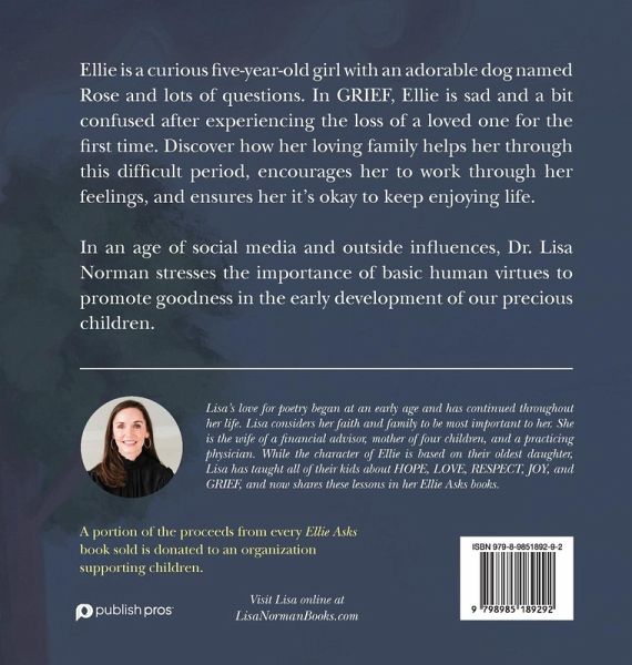 The "Ellie Asks" series introduces important but sometimes hard to understand concepts to young children through rhyme and beautifully hand-painted illustrations. This book explores the concept of GRIEF through the eyes of a child. Ellie is a curious five-year-old girl with an adorable dog named Rose and lots of questions. In GRIEF, Ellie is sad and a bit confused after experiencing the loss of a loved one for the first time. Discover how her loving family helps her through this difficult period, encourages her to work through her feelings, and ensures her it's okay to keep enjoying life.