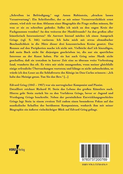 Detailliert zeichnet Richard H. Stein das Lebens des großen Künstlers nach. Hierzu geht Stein zurück bis zu den Vorfahren Griegs, bevor er Jugend und Werdegang Griegs beschreibt. Neben der persönlichen Entwicklungsgeschichte Griegs legt Stein in einem zweiten Teil zudem einen besonderen Fokus auf das musikalische Schaffen des berühmten Komponisten, wodurch ihm mit seiner Biographie ein äußerst vielschichtiger Blick auf Edvard Grieg gelingt.