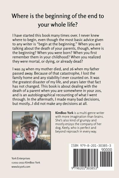 I was 24 when my mother died, and 26 when my father passed away. Because of that catastrophe, I lost the family home and any stability I ever counted on. It was the greatest disaster of my life, and years later that fact has not changed. This book is about dealing with the death of a parent when you are somewhere in your 20s, and is an autobiographical recounting of what I went through. In the aftermath, I made many bad decisions, but mostly I did not make any decisions at all. I have started this book many times over. I never knew where to begin, even though the most basic advice given to any writer is "begin at the beginning." When you are talking about the death of your parents, though, where is the beginning? When you were born? When you first remember them in your childhood? When you realized they were mortal, or dying, or already dead? Where is the beginning of the end to your whole life?