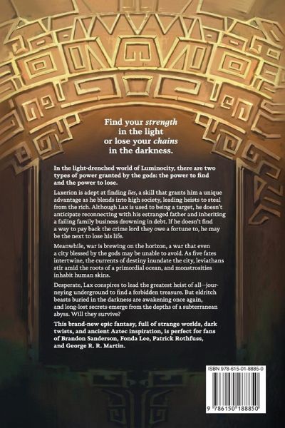 This brand new epic fantasy, full of strange worlds and dark twists, is perfect for fans of Brandon Sanderson, Fonda Lee, Patrick Rothfuss and George R. R. Martin. Find your strength in the light, or lose your chains in the darkness. Three sun gods bathe the city of legends, Luminocity, in their blessed light. The city stands on the decaying ruins of an ancient civilization. Skeletal skyscrapers guard their solemn secrets of forgotten technology and past tragedies. But under the surface the light dies and shadows began. It is a dark god's domain, even caged. And he holds his grudges through the eons. Five fates intertwine, thrown onto the currents of destiny, played like puppets. Will they be able to tear free from their strings? Laxerion Tama, disowned noble son and heist group mastermind, finds his leisurely life turned upside down. Both his estranged family and an enemy from the past test his strange ability to find lies in the light. His brother, Val-Gustus Tama, general and golden son, is forced to take responsibility for threats to the city, as war brews on the horizon. Intrigue and betrayal test his resolve and character. New and outlandish technologies emerge that push the boundaries of morality and the conscience of a young scientist, Ilumi. She arrived in Luminocity from the far north, carrying a dark secret. A huntress of the depths, Aiana, struggles with her inner demons and the chains of her past. Dawb, a young urchin struck by grief, searches for monsters prowling the short nights. And deep down, below all, eldritch things stir in the dark.