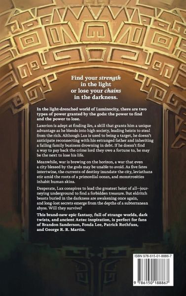 In the light-drenched world of Luminocity, there are two types of power granted by the gods: the power to find and the power to lose. Laxerion is adept at finding lies, a skill that grants him a unique advantage as he blends into high society, leading heists to steal from the rich. Although Lax is used to being a target, he doesn't anticipate reconnecting with his estranged father and inheriting a failing family business drowning in debt. If he doesn't find a way to pay back the crime lord they owe a fortune to, he may be the next to lose his life. Meanwhile, war is brewing on the horizon, a war that even a city blessed by the gods may be unable to avoid. As five fates intertwine, the currents of destiny inundate the city, leviathans stir amid the roots of a primordial ocean, and monstrosities inhabit human skins. Desperate, Lax conspires to lead the greatest heist of all-journeying underground to find a forbidden treasure. But eldritch beasts buried in the darkness are awakening once again, and long-lost secrets emerge from the depths of a subterranean abyss. Will they survive? This brand-new epic fantasy, full of strange worlds, dark twists, and ancient Aztec inspiration, is perfect for fans of Brandon Sanderson, Fonda Lee, Patrick Rothfuss, and George R. R. Martin.