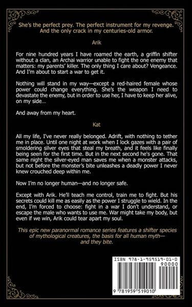 She's the perfect prey. The perfect instrument for my revenge. And the only crack in my centuries-old armor. Arik For nine hundred years I have roamed the earth, a griffin shifter without a clan, an Archai warrior unable to fight the one enemy that matters: my parents' killer. The only thing I care about? Vengeance. And I'm about to start a war to get it. Nothing will stand in my way-except a red-haired female whose power could change everything. She's the weapon I need to devastate the enemy, but in order to use her, I have to keep her alive, on my side... And away from my heart. Kat All my life, I've never really belonged. Adrift, with nothing to tether me in place. Until one night at work when I lock gazes with a pair of smoldering silver eyes that steal my breath, and it feels like finally being seen for the first time. But in the next second he's gone. That same night the silver-eyed man saves me when a monster attacks, but not before the monster's bite unleashes a deadly power I never knew crouched deep within me. Now I'm no longer human-and no longer safe. Except with Arik. He'll teach me control, train me to fight. But his secrets could kill me as easily as the power I struggle to wield. In the end, I'm forced to choose: fight in a war I don't understand, or escape the male who wants to use me. War might take my body, but even if we win, Arik could tear apart my soul. This epic new paranormal romance series features a shifter species of mythological creatures, the basis for all human myth-and they bite.