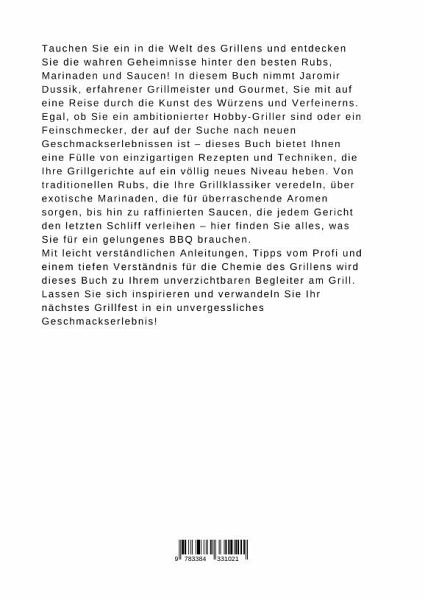 Tauchen Sie ein in die Welt des Grillens und entdecken Sie die wahren Geheimnisse hinter den besten Rubs, Marinaden und Saucen! In diesem Buch nimmt Jaromir Dussik, erfahrener Grillmeister und Gourmet, Sie mit auf eine Reise durch die Kunst des Würzens und Verfeinerns.Egal, ob Sie ein ambitionierter Hobby-Griller sind oder ein Feinschmecker, der auf der Suche nach neuen Geschmackserlebnissen ist - dieses Buch bietet Ihnen eine Fülle von einzigartigen Rezepten und Techniken, die Ihre Grillgerichte auf ein völlig neues Niveau heben. Von traditionellen Rubs, die Ihre Grillklassiker veredeln, über exotische Marinaden, die für überraschende Aromen sorgen, bis hin zu raffinierten Saucen, die jedem Gericht den letzten Schliff verleihen - hier finden Sie alles, was Sie für ein gelungenes BBQ brauchen.Mit leicht verständlichen Anleitungen, Tipps vom Profi und einem tiefen Verständnis für die Chemie des Grillens wird dieses Buch zu Ihrem unverzichtbaren Begleiter am Grill. Lassen Sie sich inspirieren und verwandeln Sie Ihr nächstes Grillfest in ein unvergessliches Geschmackserlebnis!