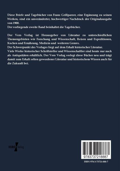 Diese Briefe und Tagebücher von Franz Grillparzer, eine Ergänzung zu seinen Werken, sind ein unveränderter, hochwertiger Nachdruck der Originalausgabe von 1900. Der vorliegende zweite Band beinhaltet die Tagebücher. Der Vero Verlag ist Herausgeber von Literatur zu unterschiedlichen Themengebieten wie Forschung und Wissenschaft, Reisen und Expeditionen, Kochen und Ernährung, Medizin und weiteren Genres. Der Schwerpunkt des Verlages liegt auf dem Erhalt historischer Literatur. Viele Werke historischer Schriftsteller und Wissenschaftler sind heute nur noch als Antiquitäten erhältlich. Der Vero…mehr