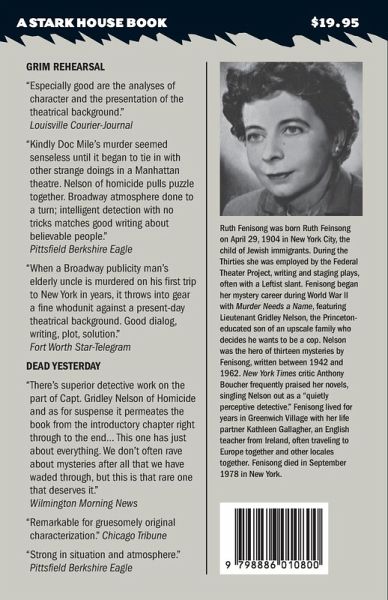 GRIM REHEARSAL Press agent Pierce Kirby is thrilled when his Uncle Doc visits, and takes him that night to a Manhattan play. They all know Pierce at the theater, so he takes his uncle backstage to introduce him around. While he is arguing with Ginette, the leading lady, his uncle wanders off. When Pierce can't find him, he figures that his uncle got tired of waiting and walked back to his hotel. The next morning Pierce is informed that Uncle Doc has been found murdered, and probably right there in the theater. That's when he meets acting-Captain Gridley Nelson. But Pierce isn't satisfied with the pace of Gridley's investigation, and so sets out to discover who killed his uncle himself. But who in the theater could have wanted the harmless old man dead? And why? DEAD YESTERDAY Thea had been a beautiful model until she met Count Dino Mazzani. But after they married, his true womanizing colors came out. And after his death, she just let herself go. Now, overweight and barely recognizable, she sits in her apartment and drinks. Until her old love, Grant Barstow, shows up. Seeing the shock in his face, the countess has her maid clean up the apartment. Then Coley Spenser, her late husband's former valet, makes an appearance, looking for cash and whatever else he can find... soon followed by Thea's niece, whom Thea has never met before, but who bears a striking resemblance to her younger self. What Spenser finds and how Thea reacts to seeing her niece for the first time leads to a room full of death for Gridley Nelson.
